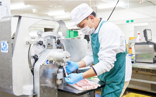 食肉加工の部門としては、ベーコンやチキンなどの加工品と、串刺しや、鶏肉の解体、給食用食材のグラムカット等を担当しています。入社直後から最初の1年間は鶏肉の解体部門にいましたが、流れ作業ですので私が遅れたら次の人に迷惑がかかるというプレッシャーもあり、かなり鍛えられました。やはり自分のせいで皆さんに迷惑をかけたくないですから。心がけているのは、常に高いクォリティーを維持し、少しでも綺麗に仕上げることです。もちろん、スピードを上げて円滑に仕事を進めることも念頭においています。
